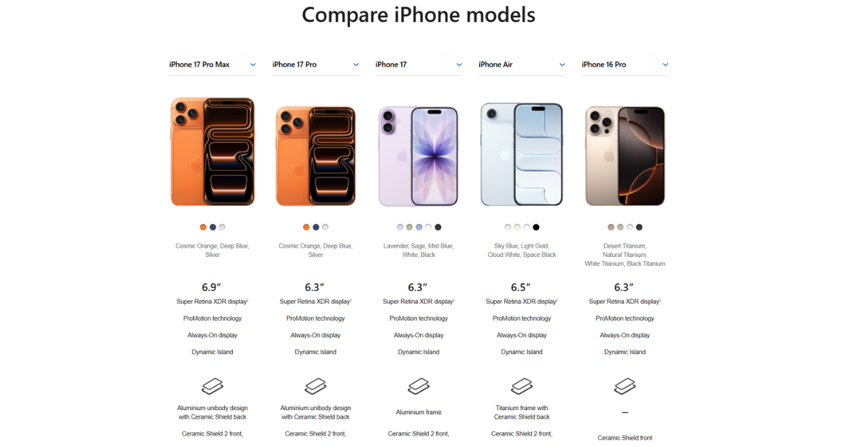 Mix and match the iPhone 17 Pro, iPhone 17 Pro Max, or even other models in the lineup, and you’ll instantly get a clear view of the differences that matter most to you. It’s like a cheat sheet for decision-making — only prettier.